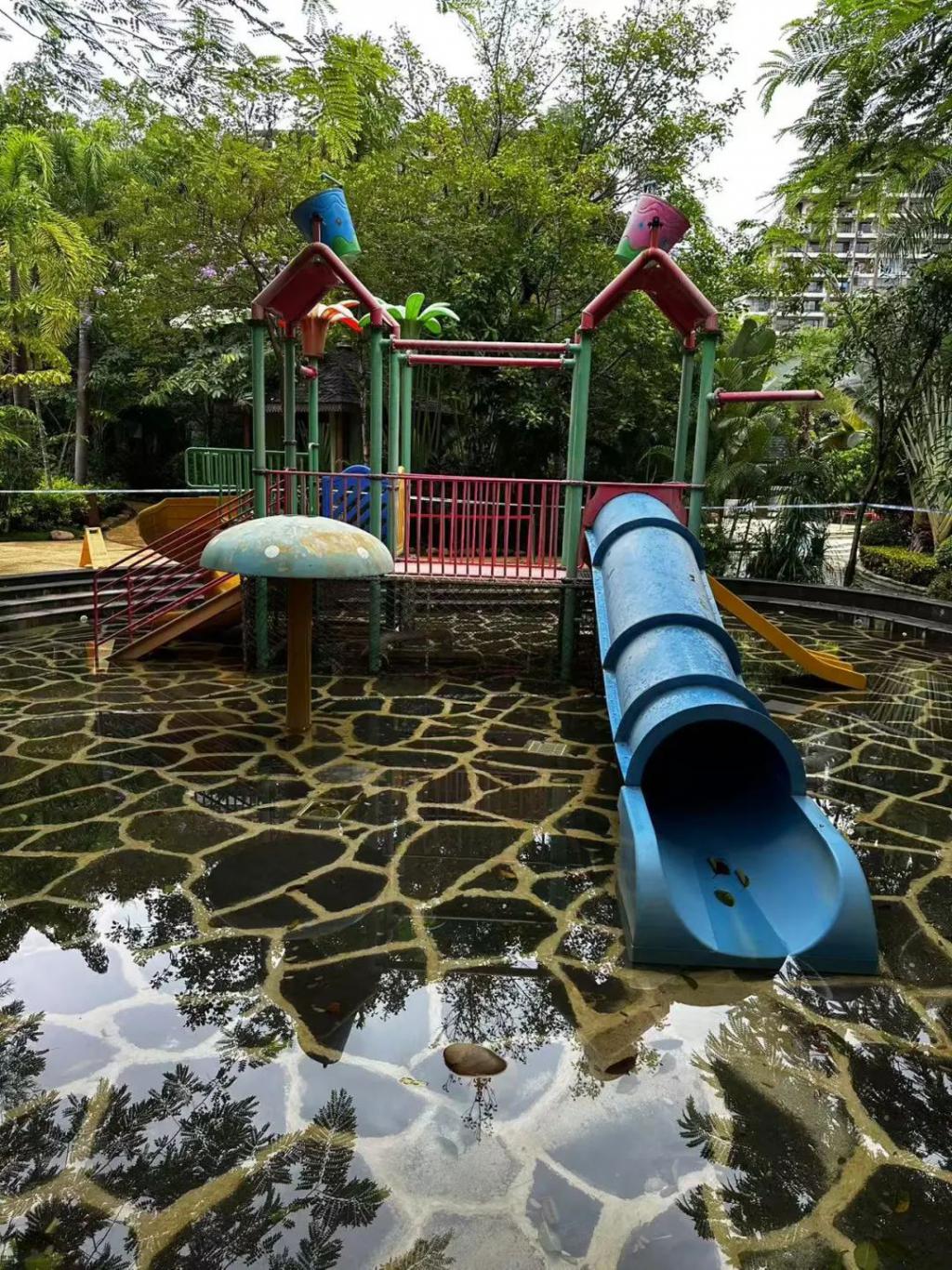 这片水上儿童乐园位于酒店客房附近的温泉区。悦悦的母亲林静(化名)说,报团时,旅行社极力推荐这家酒店,最大卖点就是有温泉和配套儿童游乐设施。