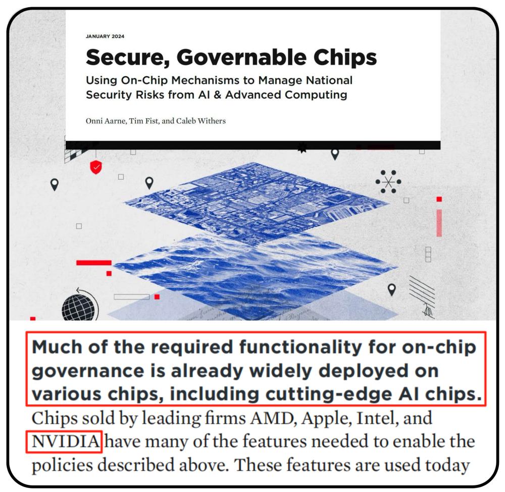 △新美国安全中心报告《安全、可管控的芯片——使用片上治理机制来管理人工智能和高级计算的国家安全风险》,报告中提到,片上治理所需的许多功能已在各类芯片上广泛部署,包括尖端的人工智能芯片。AMD、苹果、英特尔和英伟达等领先企业销售的芯片就具备上述诸多政策所需的功能。
