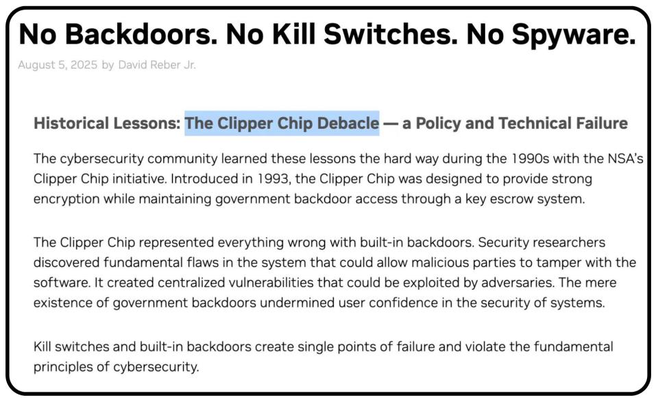 英伟达在随后的自辩声明中提到,芯片没有 " 后门 ",他们还专门提到了 "Clipper 芯片 " 事件。