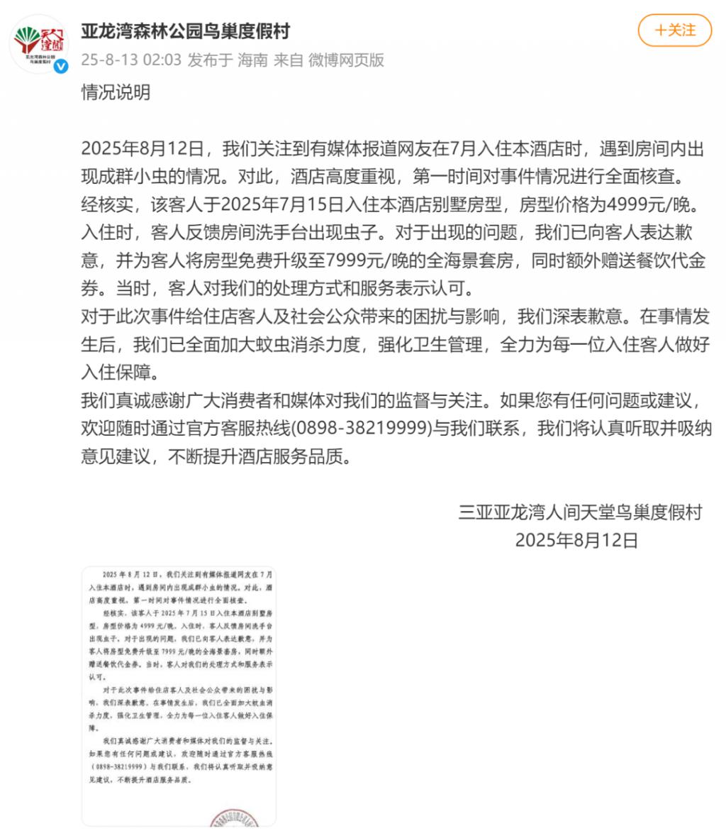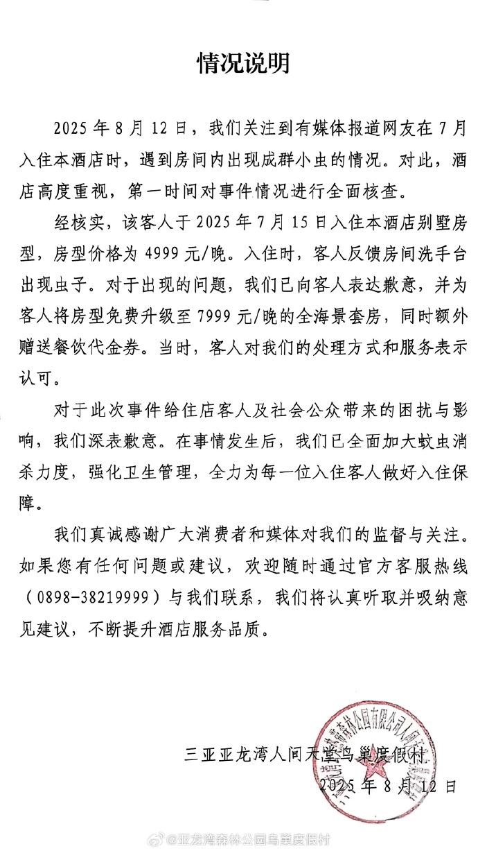 2025 年 8 月 12 日,我们关注到有媒体报道网友在 7 月入住本酒店时,遇到房间内出现成群小虫的情况。对此,酒店高度重视,第一时间对事件情况进行全面核查。