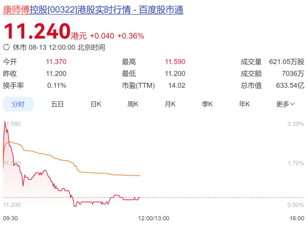 市场方面,截至发稿,康师傅控股午盘报 11.24 港元,上涨 0.36%,最新市值 633 亿港元。