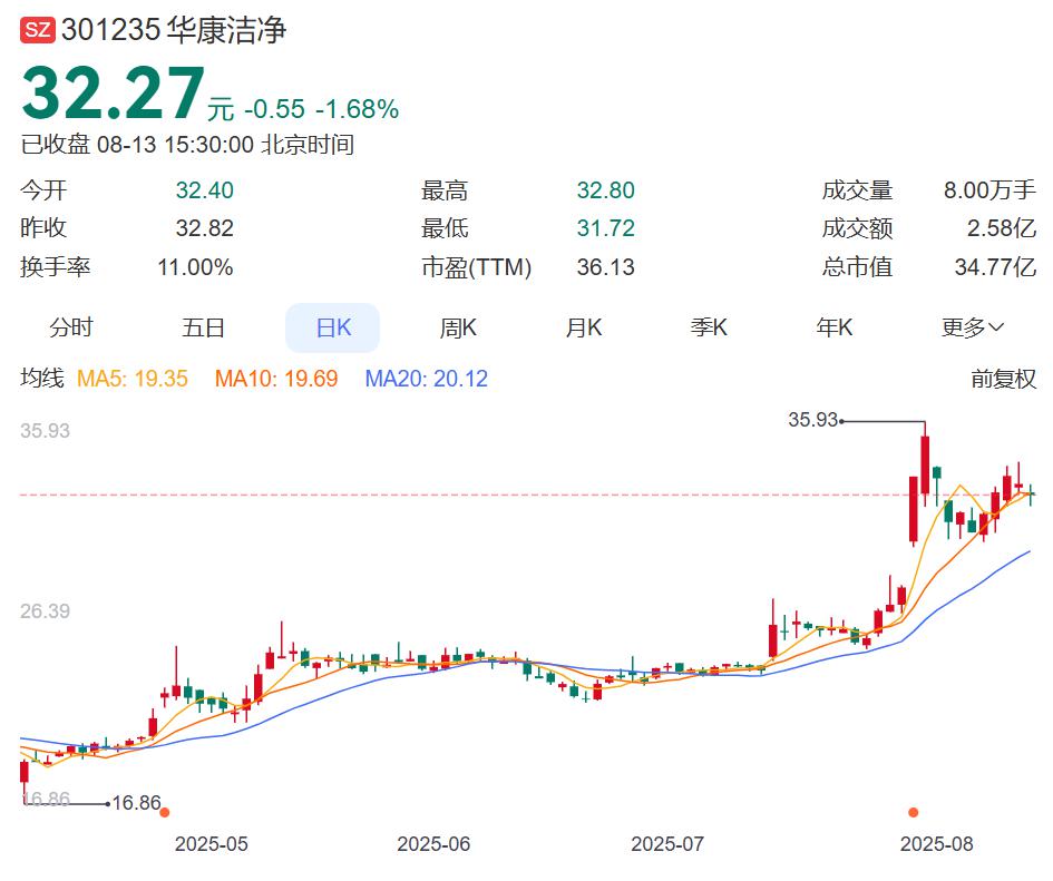 截至 8 月 13 日,华康洁净股价报收 32.27 元 / 股,年内已涨超 60%,总市值 34.77 亿元。