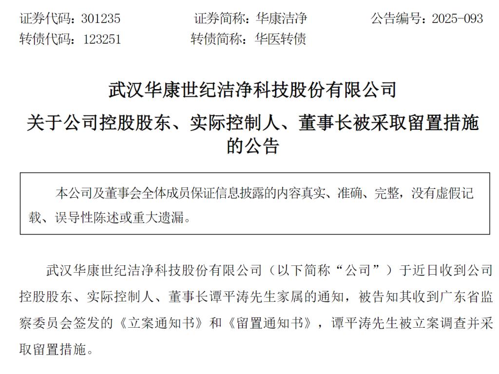 8 月 13 日晚间,湖北武汉上市公司华康洁净(SZ301235,股价 32.27 元,市值 34.77 亿元)公告称,公司近日收到控股股东、实际控制人、董事长谭平涛家属的通知,被告知其收到广东省监察委员会签发的《立案通知书》和《留置通知书》,谭平涛被立案调查并采取留置措施。
