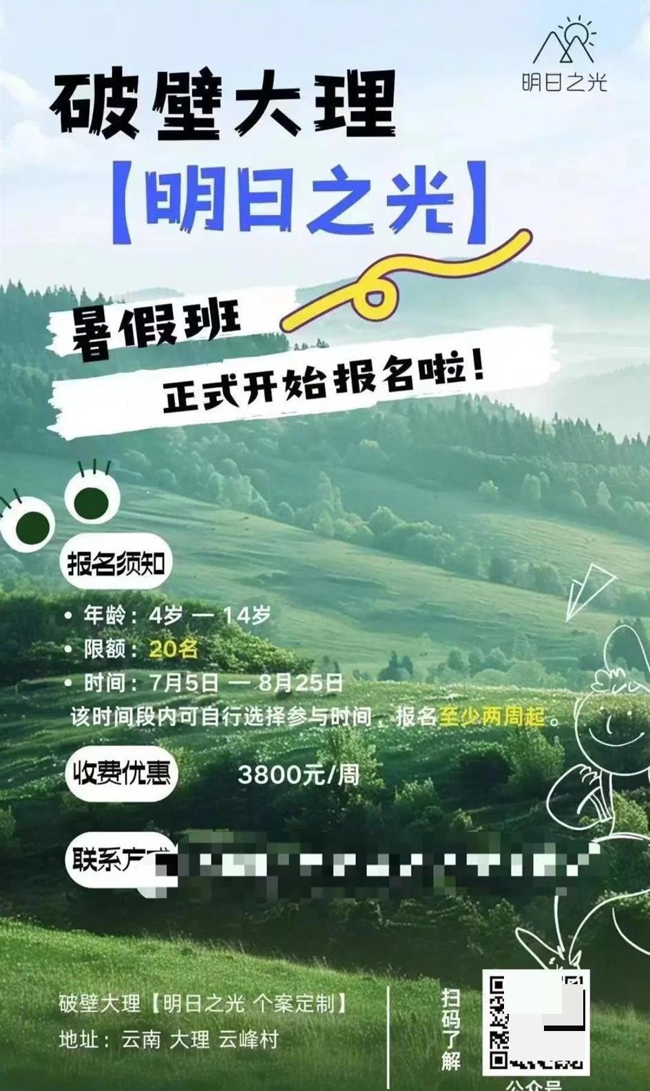 记者实地走访 " 明日之光 " 夏令营时看到,该夏令营有一个院子,主体建筑为 3 层楼房。村民称,这是外地人租用当地的民房进行营业。根据此前网传的一张该机构的海报,其中报名须知表示:年龄 4-14 岁,限额 20 名,时间为 7 月 5 日 -8 月 25 日,在该时段内可自行选择参与时间,报名至少两周起,收费为 3800 元 / 周。