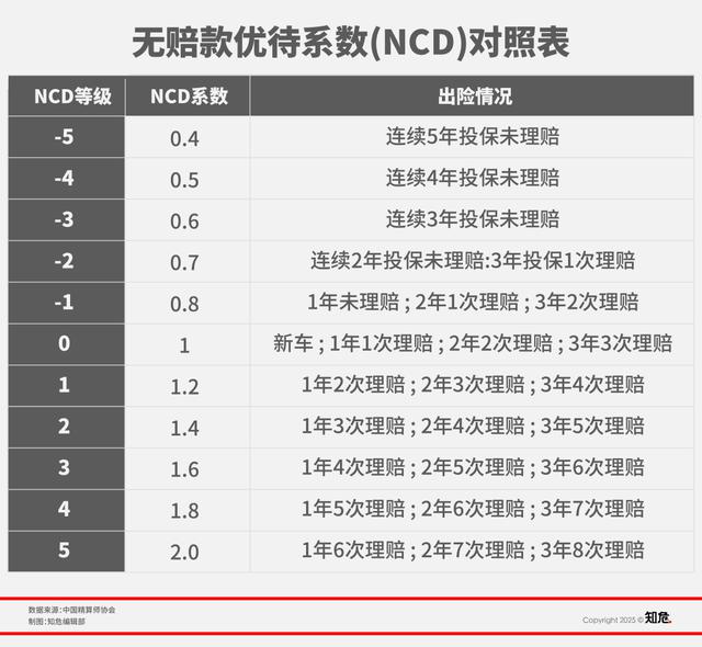 在这个公式中,无赔款优待系数( NCD 系数,no-claim discount )是商业险中为数不多与车主驾驶行为直接挂钩的变量。该系数基于车辆历史出险记录动态调整保费的奖惩机制,不同保险公司执行统一标准,旨在通过 " 奖优罚劣 " 实行风险与成本匹配。