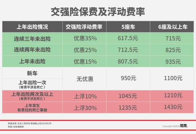 其中,基础保费对于同一类型车型都是全国统一的。比如,家庭自用 6 座以下汽车基础保费为 950 元,6 座以上为 1100 元。形成交强险最终保费区别的还是在于浮动费率,即承保车辆是否发生过道路交通事故,是否产生过交通安全违法行为。