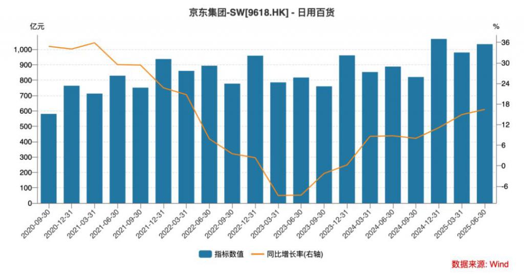 如果说 3C 家电营收的快速增长一定程度上受益于国补和 618 带来的红利,那么公司日用百货营收增速的持续提升则更多是内生因素的发力。从社零角度看,二季度我国限额以上商品零售总额增速约 9.61%,其中日用品同比增长 10.81%,京东日用百货营收增速跑赢了行业大盘。