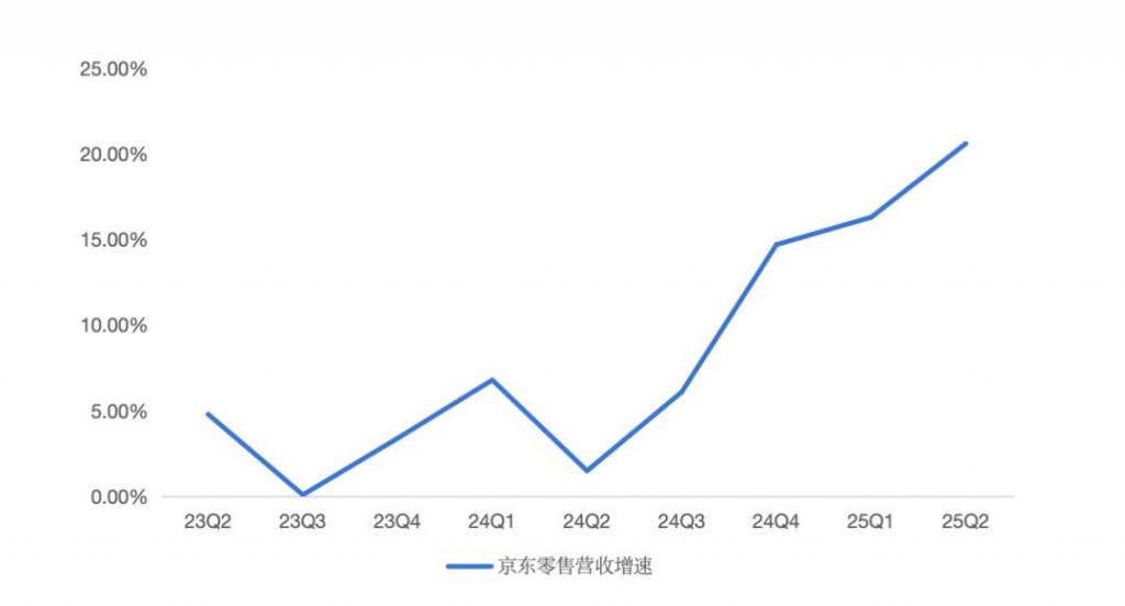 数据上,京东零售 2025 年二季度实现营收 3100.75 亿元,同比增长 20.6%;实现经营利润 139.39 亿元,同比增长 37.9%,经营利润率从去年同期的 3.9% 提升至 25Q2 的 4.5%。与历史季度相比,京东零售的 25Q2 的营收增速达到 2023 年以来的最高值,且季度营收增速呈现持续抬升的趋势。