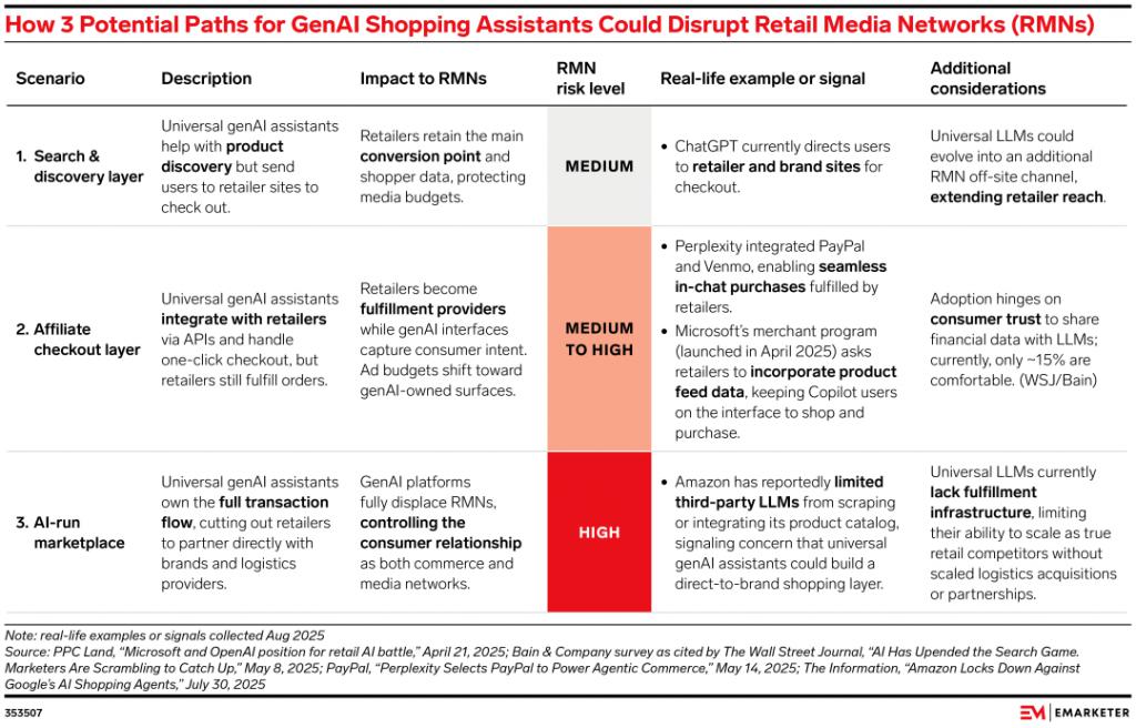 eMarketer 最近整理了一个颇具洞察力的视角,描绘了 AI 购物助手在未来三种可能路径下,对零售电商价值链的不同切割方式。这个框架,其实正好也能作为今天 " 电商入口之争 " 的一张地图: