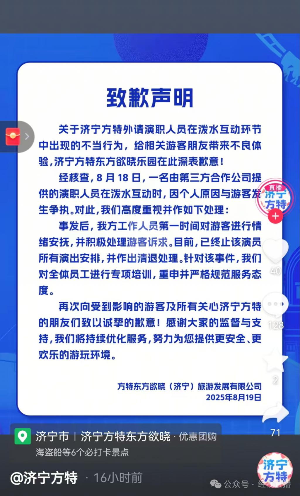 8 月 19 日,方特东方欲晓(济宁)旅游发展有限公司发布道歉声明: