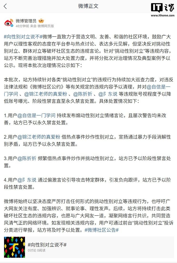 IT 之家 8 月 19 日消息,@微博管理员 连续两天发文,宣布封禁多个煽动性别对立账号。IT 之家附原文如下: