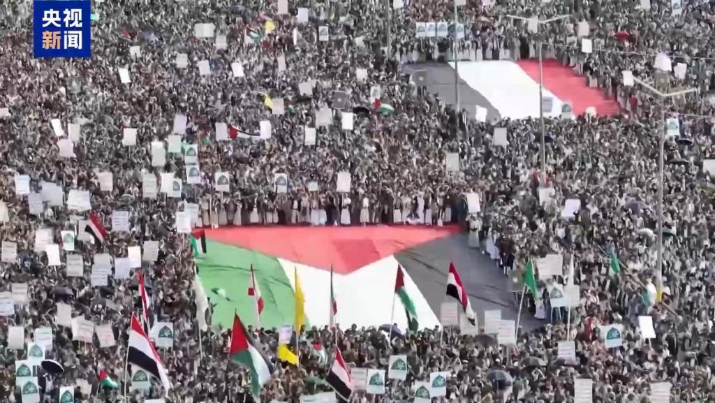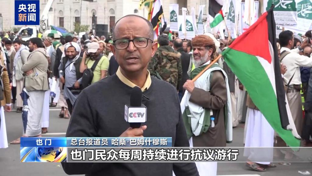 总台报道员 哈桑 · 巴姆什穆斯:伴随以色列政府坚持出台更多关于占领加沙地带扩大战争的决定,在萨那南部的广场,也门民众每周持续进行抗议游行谴责以方的决定,并抗议加沙地带正在发生的杀戮。