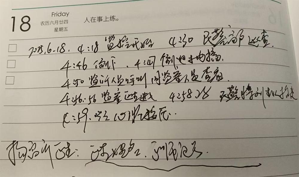 事发后,在家属的要求下,警方与刘女士等人共同观看了监控视频,刘女士用笔记载:6 月 18 日 4 时 46 分,刘某火在监室倒地;47 分,倒地抽搐;50 分,呼叫同监室人员查看;4 时 56 分 56 秒,监室医生进入;4 时 58 分 28 秒,民警将其抬走;4 时 59 分,医务人员开始实施心肺复苏。
