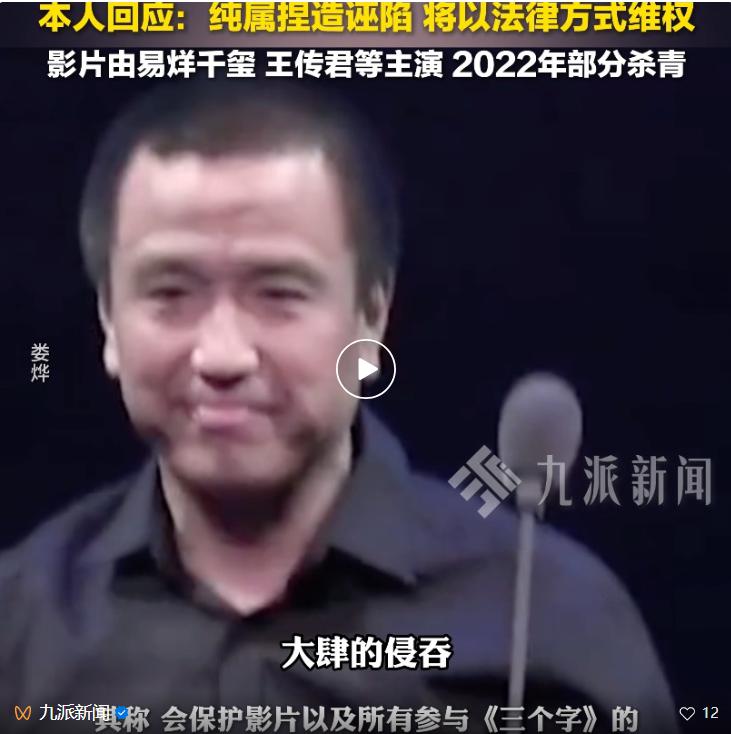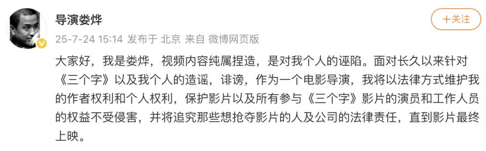 娄烨表示:" 大家好,我是娄烨,视频内容纯属捏造,是对我个人的诬陷。面对长久以来针对《三个字》以及我个人的造谣,诽谤,作为一个电影导演,我将以法律方式维护我的作者权利和个人权利,保护影片以及所有参与《三个字》影片的演员和工作人员的权益不受侵害,并将追究那些想抢夺影片的人及公司的法律责任,直到影片最终上映。"