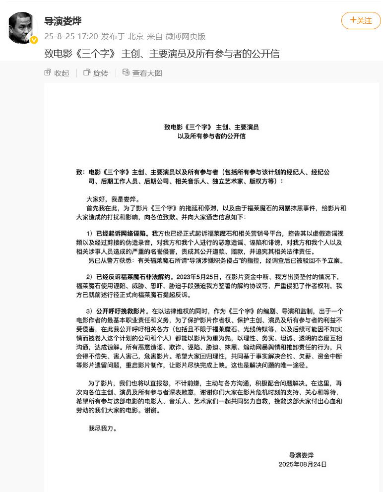 近日,知名导演娄烨被曝职务侵占一事在网络上引发关注。8 月 25 日,娄烨发布致电影《三个字》主创、主要演员及所有参与者的公开信,称已经起诉网络诬陷,并已经反诉福莱魔石非法解约。