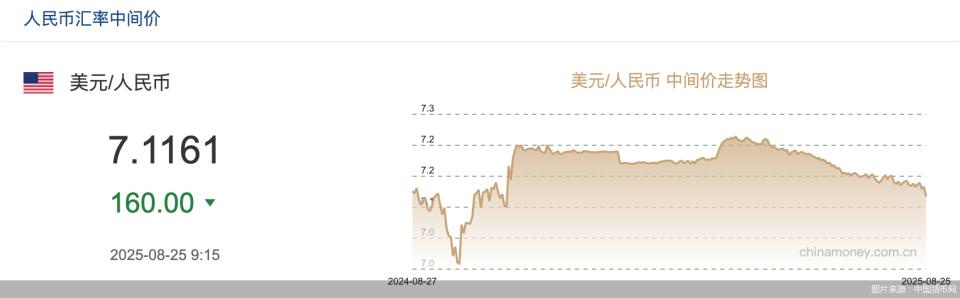 8 月 25 日,中国人民银行授权中国外汇交易中心公布,当日银行间外汇市场人民币汇率中间价为 1 美元对人民币 7.1161 元,相较前一交易日中间价 7.1321 元,调升 160 个基点,创 2024 年 11 月以来新高。2025 年 5 月中旬以来,人民币对美元中间价升值态势明显,从 7.2 左右波动升值至当前 7.11 附近。
