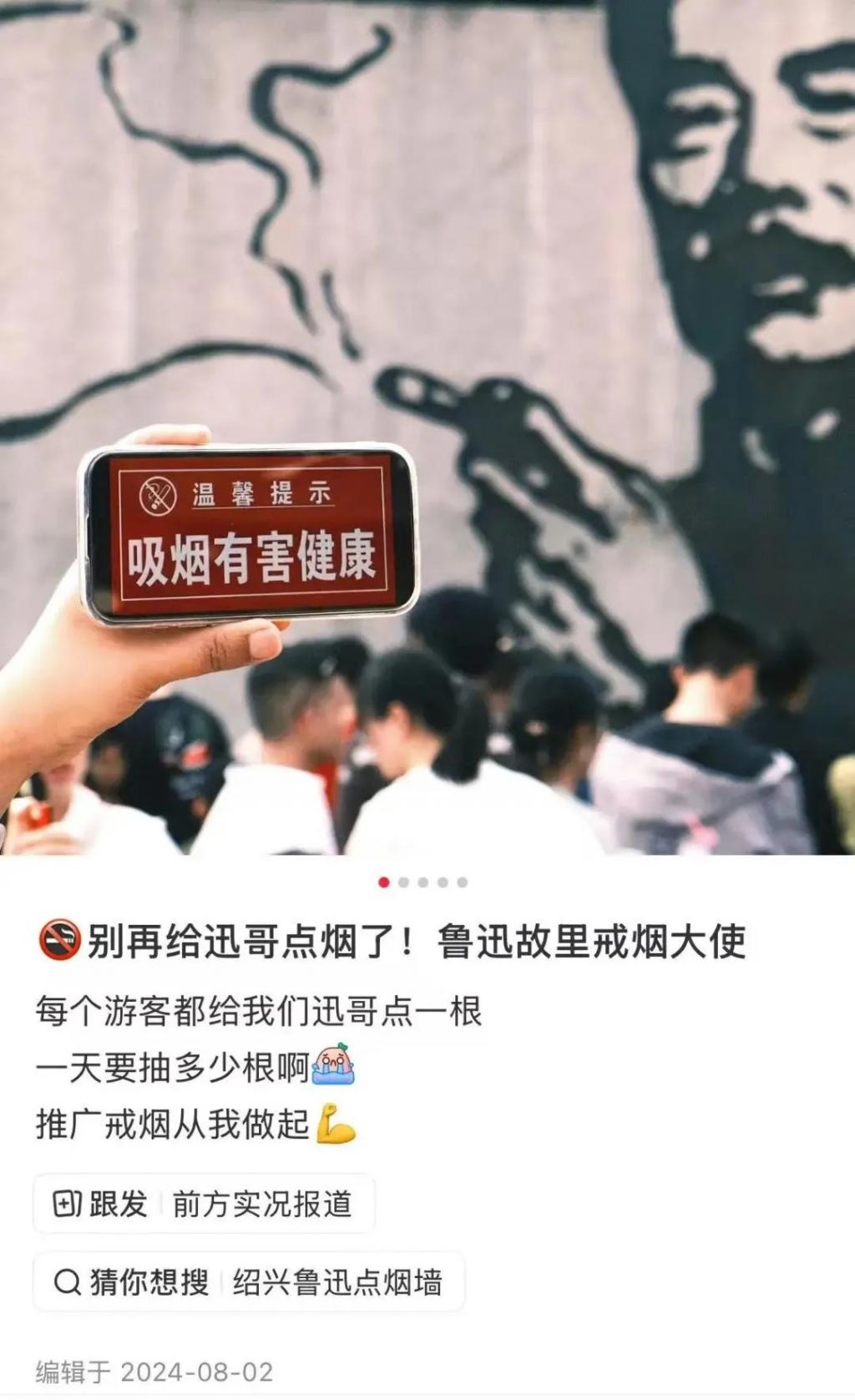 浙江省绍兴市的鲁迅纪念馆有一面鲁迅手里夹着香烟的网红打卡墙,部分游客到鲁迅纪念馆参观游览,会到这面墙点燃打火机或者香烟,拍一张打卡照。