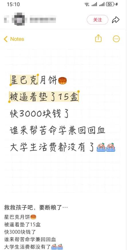 这位网友称:" 被逼着垫了 15 盒,金额近 3000 元,谁能帮苦命学兼回回血,大学生活费都没有了。"