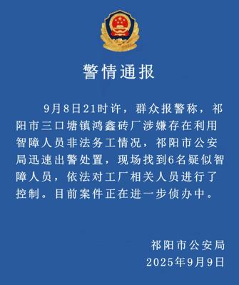 《法治日报》记者 9 月 9 日从湖南省祁阳市公安局官方微信公众号 " 祁阳公安 " 获悉,9 月 8 日晚,根据群众报警线索,当地一砖厂涉嫌非法雇用智障人员务工。警方迅速出动,在现场查获 6 名疑似智障人员,并依法控制涉事工厂相关负责人。目前,案件正在进一步侦办中。