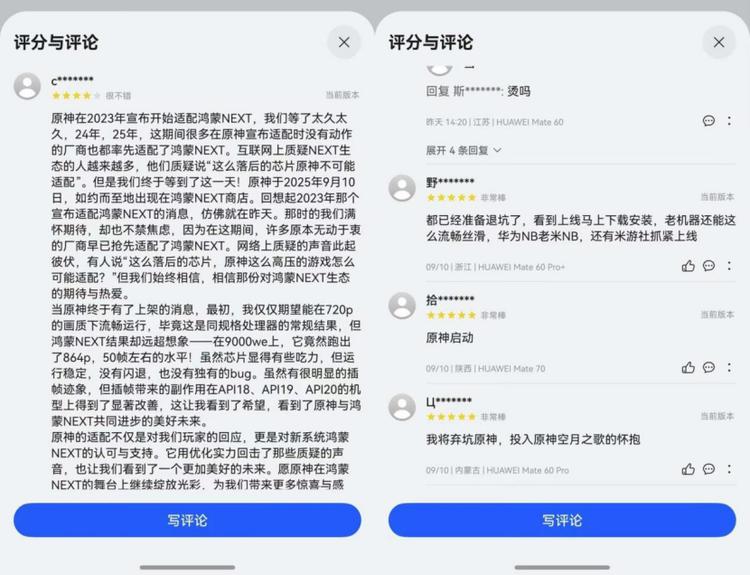 截至发稿前,已有超 3000 名用户为鸿蒙版《原神》打出了接近满分的分数,其中多是对流畅性的认可和对未来体验的期待。