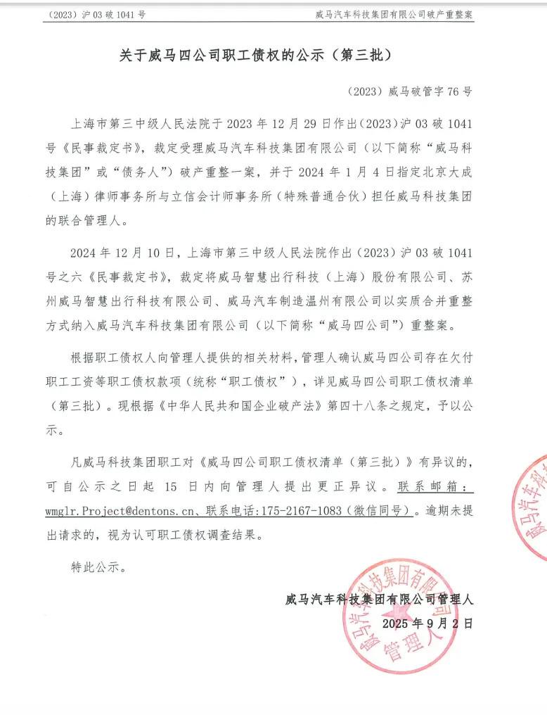 同时,记者还在全国企业破产重整信息网上查询到威马汽车已公布部分职工债权的公示。但一位离职许久的前威马员工告诉记者,即便新的股东已经入场,他的工资和赔偿至今也没有拿到。