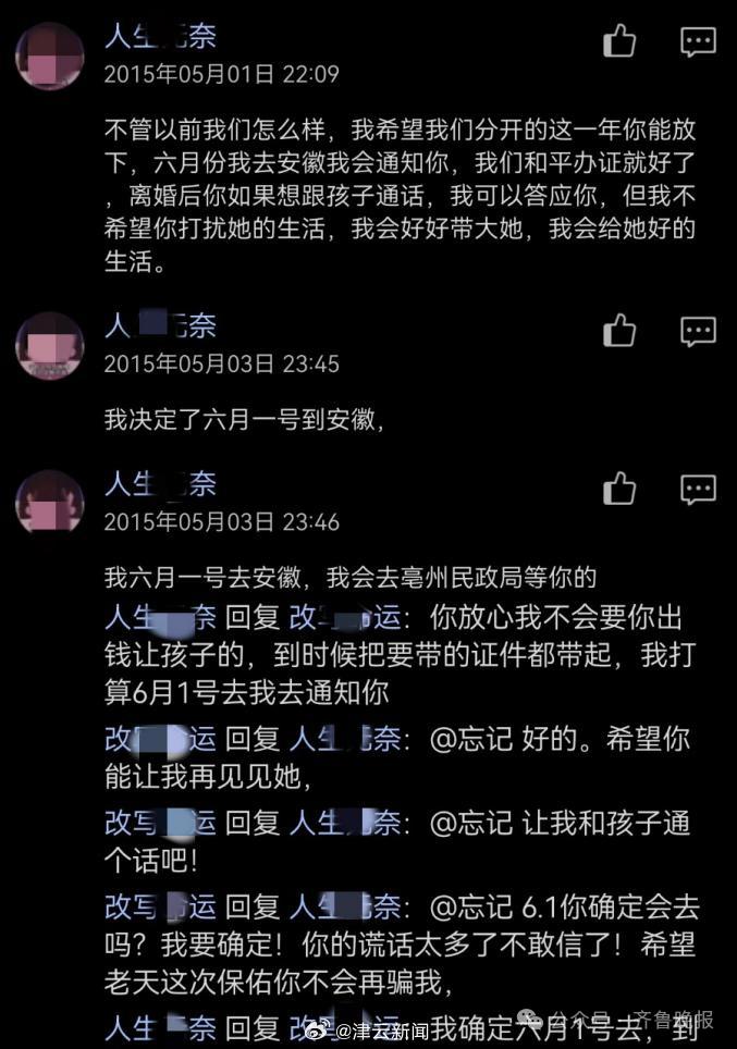白蕾称,刘某之前使用的手机号停机后,她与刘某唯一的联系方式就是 QQ 空间的动态留言。她每一次想女儿时,都是在 QQ 空间留言,希望刘某看到后让她见见女儿。" 我跟女儿分开不到半年就后悔了,我想把女儿接回来,但我联系不上刘某。"