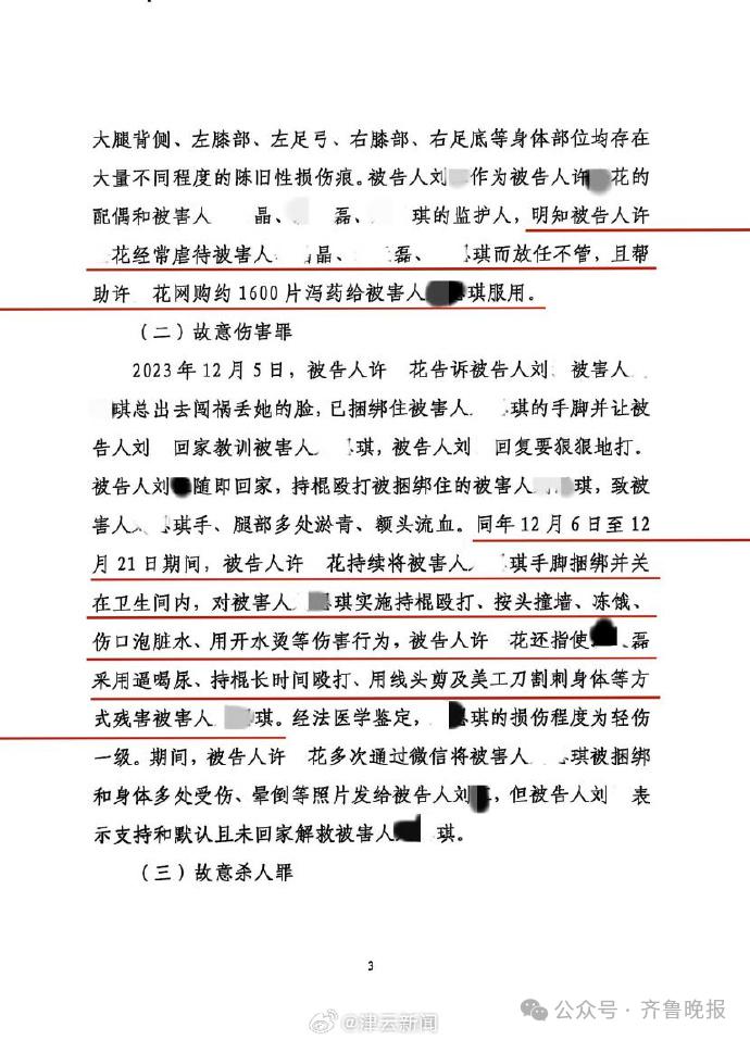 此外,莆田中院还审理查明,2023 年 12 月 22 日,被告人许某花在被害人琪琪手脚被绑、关在卫生间 17 天且无正常饮食身体虚弱的情况下,仍指使小磊持水管棍子重击琪琪的头部、踢踹琪琪,亲手持水管击打琪琪。