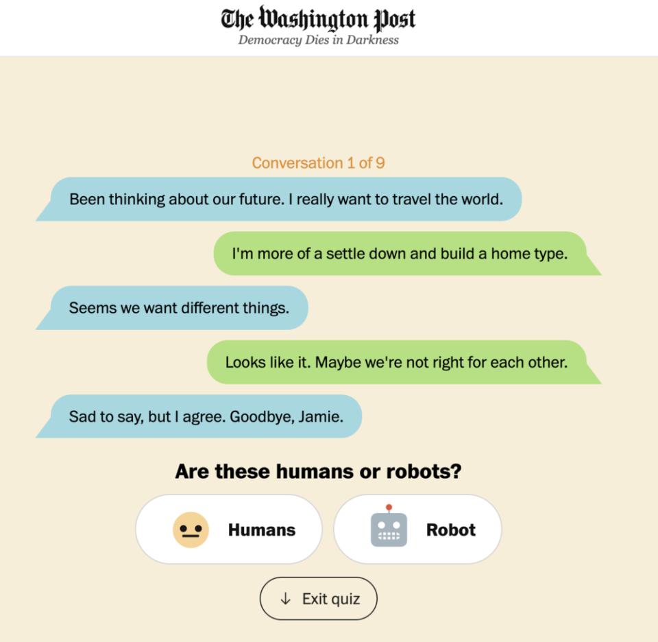 人们最开始只把这件事当作乐子讲,华盛顿邮报甚至做了一个专门的问卷来调侃这些人机不明的分手感言。