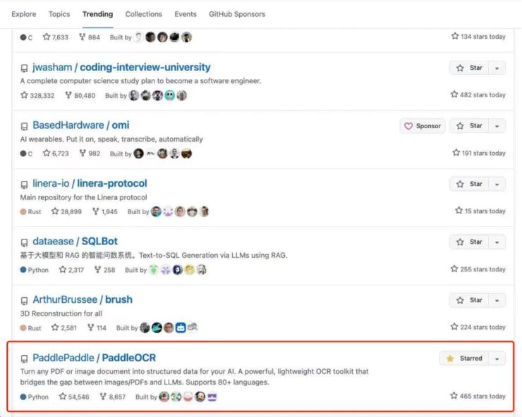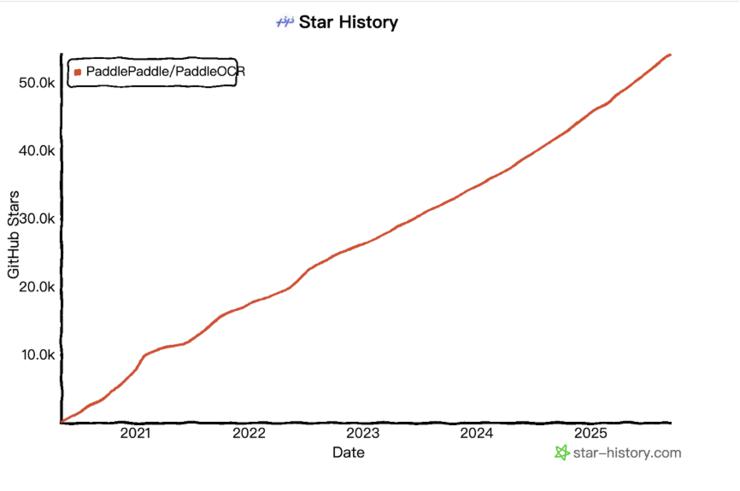 据了解,2025 年 5 月,飞桨团队推出 PaddleOCR 3.0 版本,文字识别方案 PP-OCRv5 与通用文档解析方案 PP-StructureV3,以及原生支持文心大模型 4.5 的智能文档理解方案 PP-ChatOCRv4 共同构成其三大特色能力。自 2020 年开源以来,PaddleOCR 累计下载量突破 900 万,被超过 5.9k 开源项目直接或间接使用,是 GitHub 社区中唯一一个 Star 数超过 50k 的中国 OCR 项目。