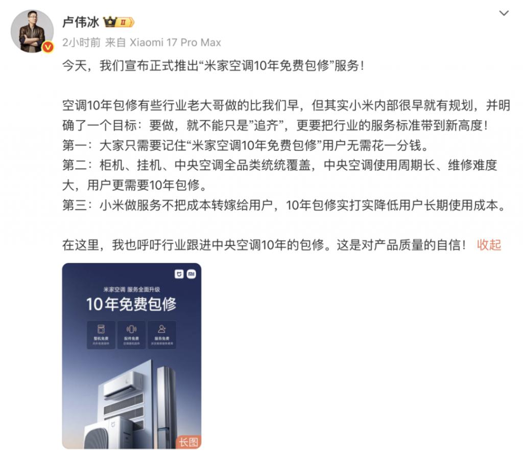 对此,小米集团合伙人、总裁,手机部总裁,小米品牌总经理卢伟冰发文称:" 空调 10 年包修有些行业老大哥做得比我们早,但其实小米内部很早就有规划,并明确了一个目标:要做,就不能只是‘追齐’,更要把行业的服务标准带到新高度!第一:大家只需要记住‘米家空调 10 年免费包修’,用户无需花一分钱。第二:柜机、挂机、中央空调全品类统统覆盖,中央空调使用周期长、维修难度大,用户更需要 10 年包修。第三:小米做服务不把成本转嫁给用户,10 年包修实打实降低用户长期使用成本。"