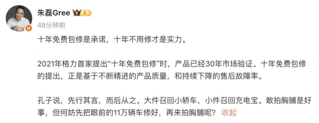 随后,格力高管朱磊发文称,十年免费包修是承诺,十年不用修才是实力。朱磊同时发文称:" 大件召回小轿车,小件召回充电宝。敢拍胸脯是好事,但何妨先把眼前的 11 万辆车修好,再来拍胸脯呢?"