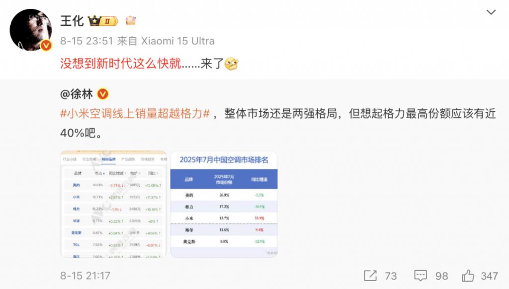 据悉,8 月份," 小米空调线上销量超越格力 " 的话题引发市场关注,对此,朱磊曾发长文回应。