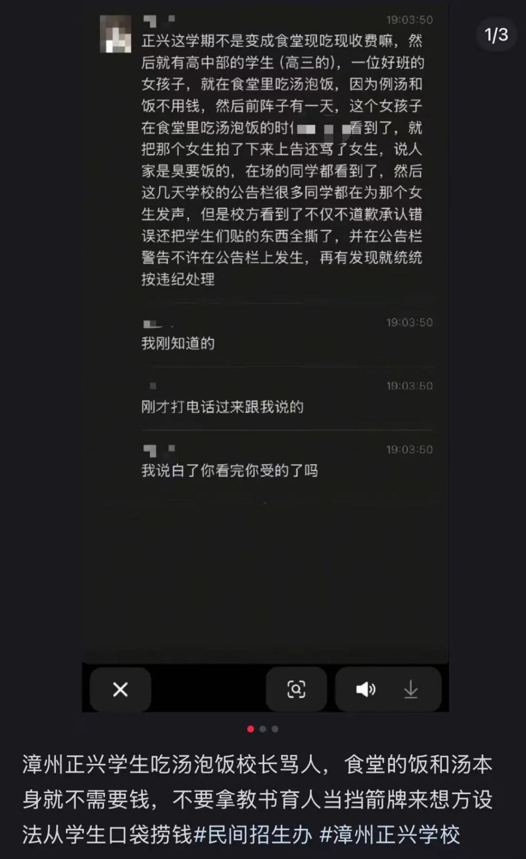 近日,有多名网友发帖称,在福建漳州正兴学校,一高三女生在食堂吃免费的汤泡饭被一校领导看到后,女生被校领导拍下并辱骂 " 臭要饭的 "。