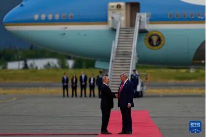 当地时间 8 月 15 日 11 时许,美国总统特朗普(前右)和俄罗斯总统普京在美国阿拉斯加州安克雷奇市埃尔门多夫 - 理查森联合军事基地的机场会面,但近来,特朗普声称普京引起他的不满 图:新华社 / 美联
