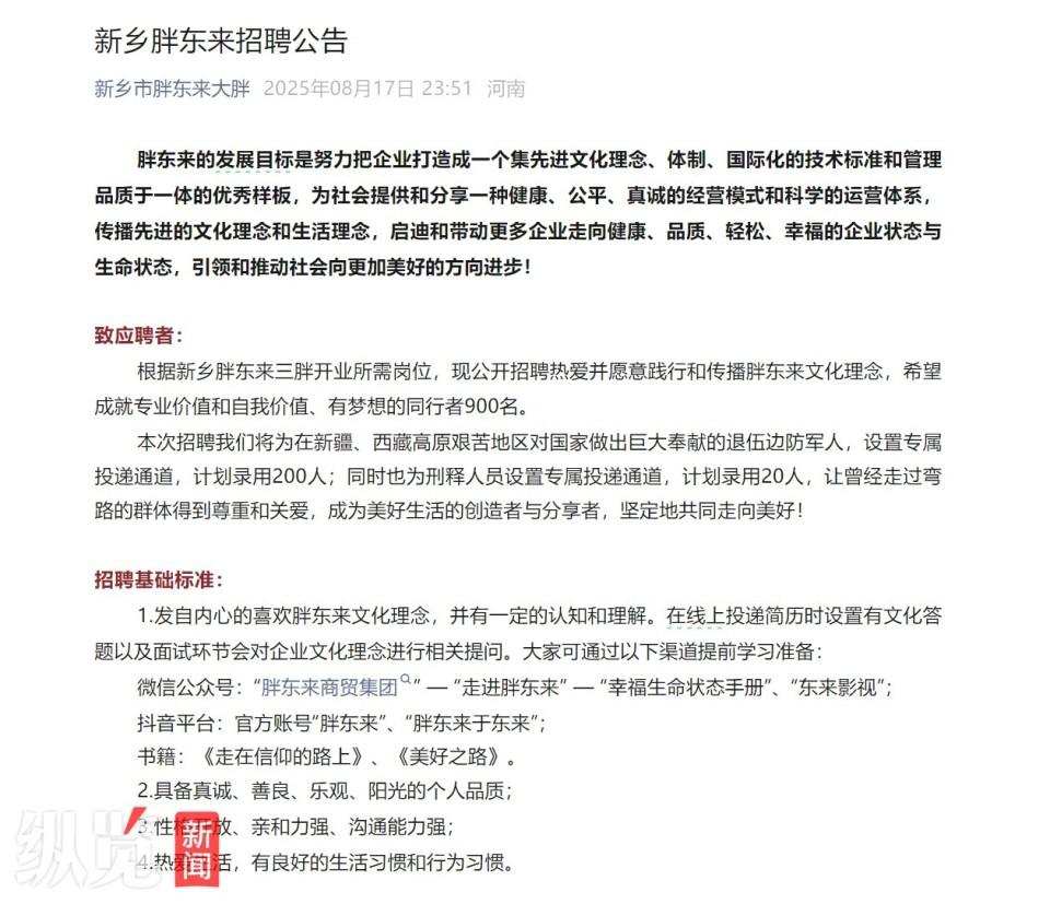 胖东来发布的招聘公告。(来源 / 新乡市胖东来大胖)
