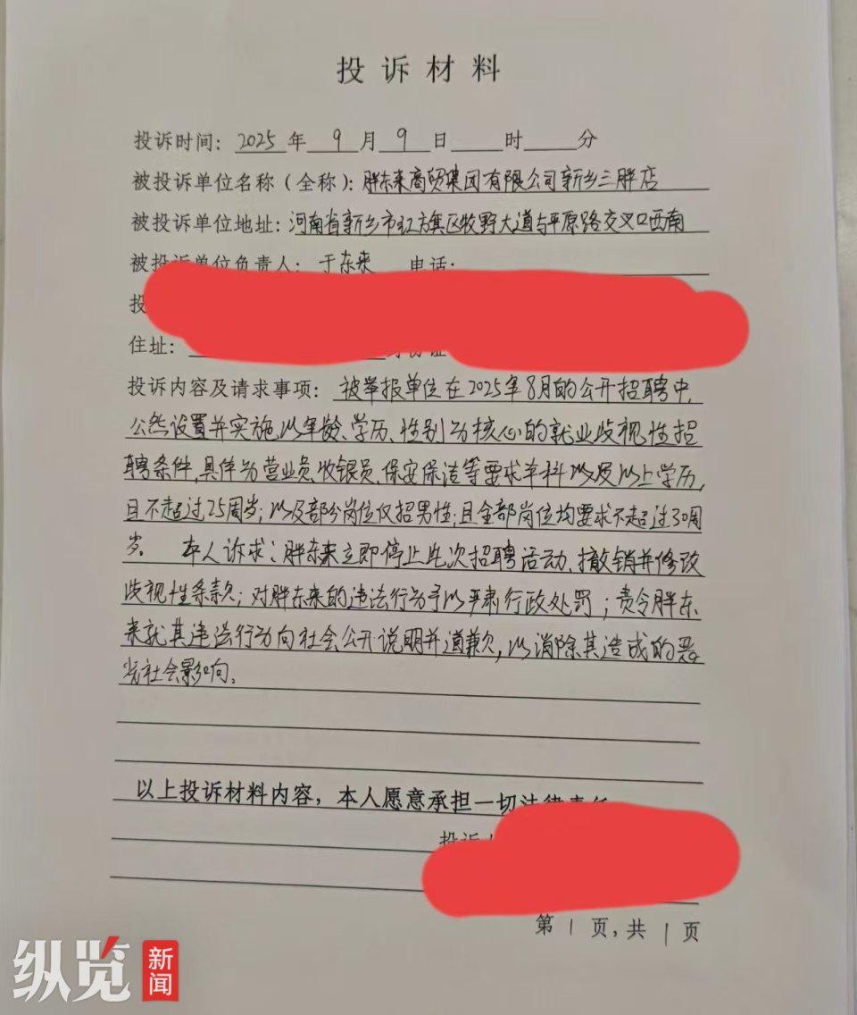 河南新乡一男子投诉胖东来招聘涉嫌年龄、性别歧视,人社局回应