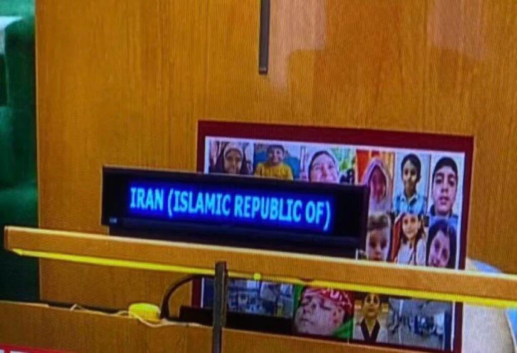 哦,伊朗的席位上,摆放着的是以色列袭击受害者的图片。