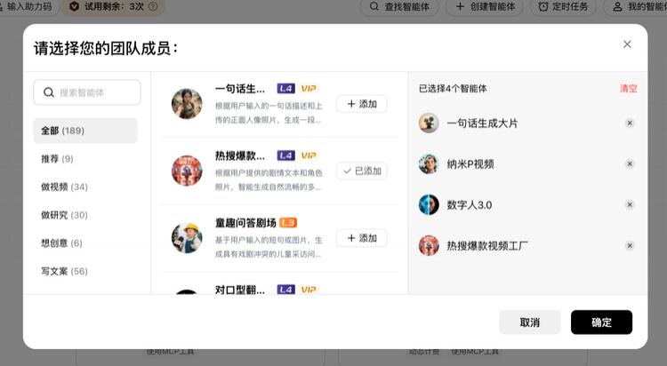 更进一步的是,用户可以根据自己的工作流程创建智能体团队。只需一个指令输入,L4 智能体蜂群就像指挥了一个 AI 的 MCN,让多个专业人士组队执行复杂任务,让各个专业智能体分工协作。