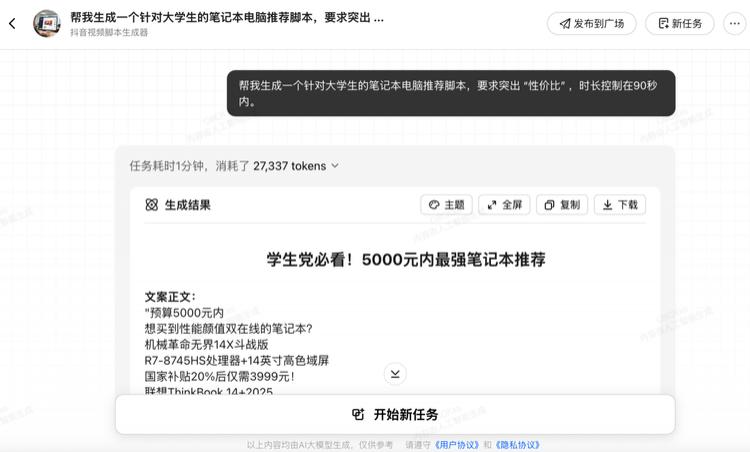 在纳米 AI 中,我们已经能够清晰地看到 L4 多智能体协作的成熟应用。通过一次简单的演示可以发现,当用户使用 " 抖音脚本生成 " 智能体完成初始任务后,系统会智能分析用户需求并自动推荐相关智能体。用户可以根据具体需要选择下一步操作:比如选择 " 爆款标题策划师 ",它能够直接基于前一个智能体的生成结果来创作标题。通过这种智能体的连续协作,最终可以生成一个完整的数字人口播抖音视频。