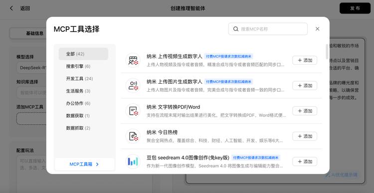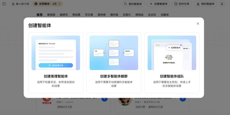在创建过程中,用户拥有极大的自主权:可以创建单个智能体、组建多智能体蜂群,或者用现有智能体进行灵活组队。系统支持用户自主选择调用各类模型、集成 MCP 工具,甚至连专业的提示词都会智能生成。整个创建过程就像 " 微信拉群 " 一样简单直观,用户可以轻松创建专属智能体并发布到平台。