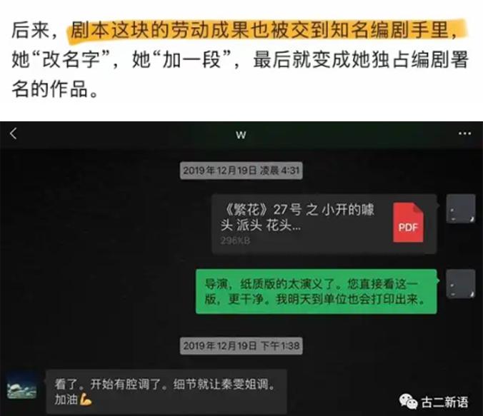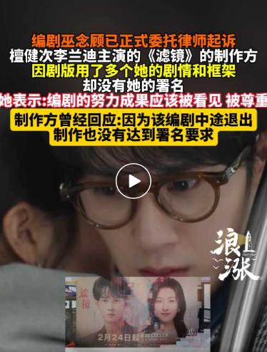 今年 3 月,一位名叫巫念顾的编剧也发文表示,她给电视剧《滤镜》写的全剧故事大纲、人物小传、26 集分场及 12 集对白剧本创作都被采用了,但自己没有获得任何署名权。