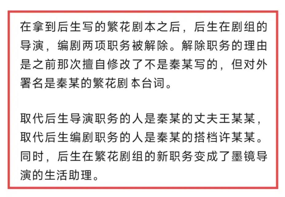 他说秦雯是在他的剧本基础上调整了细节,但这些所谓的细节到底是什么,也没人说。