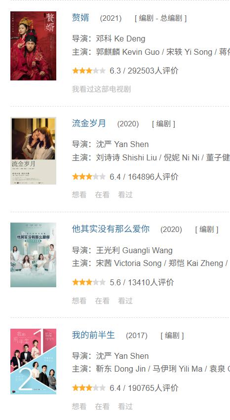 几乎每年都有她的编剧作品上映,既有《我的前半生》这样的都市生活剧,又有《赘婿》这种古装男频剧,还有《繁花》这类大戏。