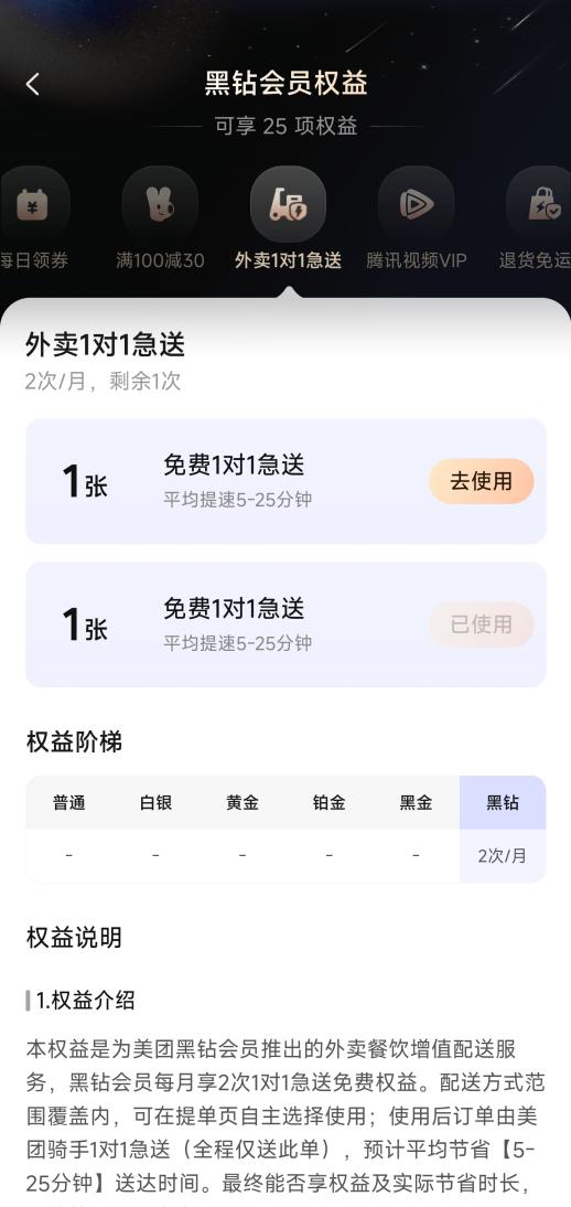 ▲黑钻会员每月可享 2 次免费 "1 对 1 急送 " 权益。图源:美团 App