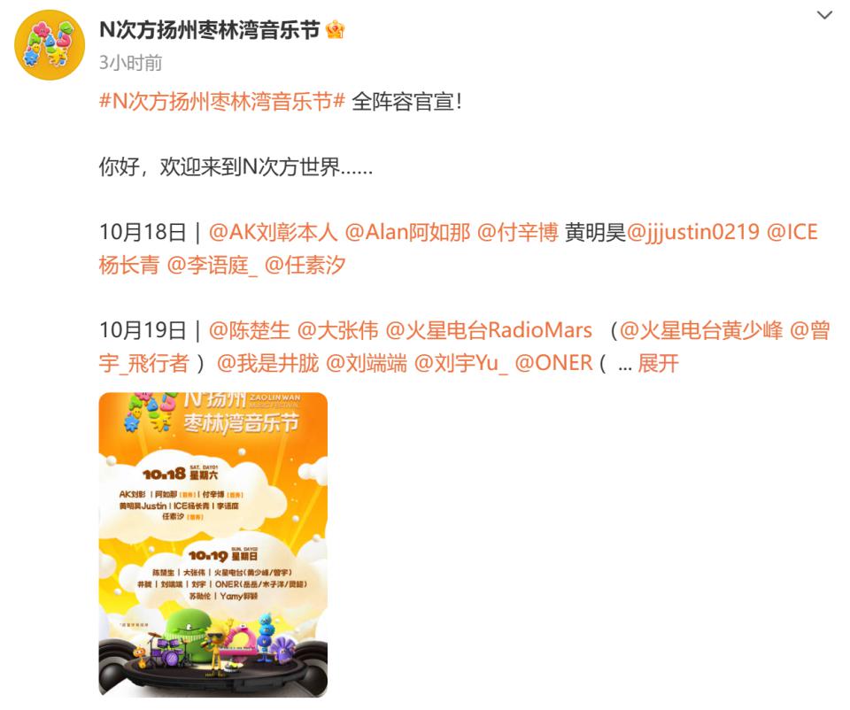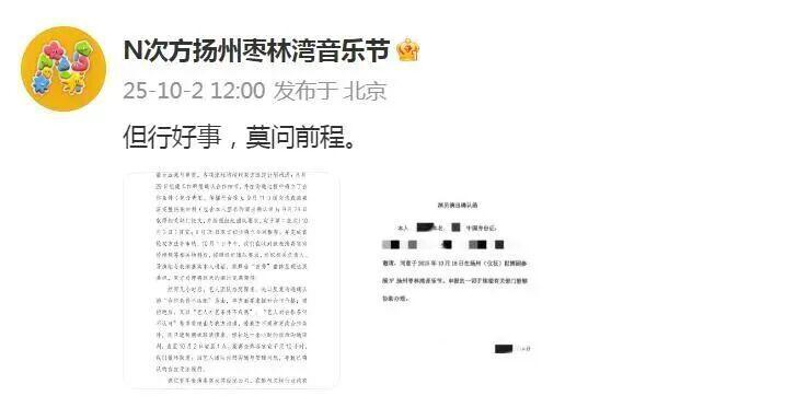 10 月 2 日,N 次方扬州枣林湾音乐节发布情况说明,披露原定参演的一位青年表演嘉宾因经纪团队临时 " 坐地起价 ",最终无法如期官宣。该消息迅速引发行业热议。