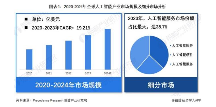 2023 年全球人工智能产业市场规模达 5381 亿美元,三年复合增速达 19.21%。初步估算,2024 年全球人工智能产业市场规模将达到 6382 亿美元。从细分市场来看,2023 年人工智能服务市场份额占比最大。全球人工智能市场可分为人工智能软件、人工智能硬件以及人工智能服务。根据统计,2023 年全球人工智能服务市场占据人工智能市场的 38.7%,占比最大。