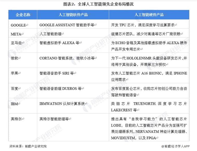 当前,全球人工智能领域的头部企业主要以美国或中国的互联网 / 科技巨头为主,这些企业凭借多年的互联网或软硬件开发基础以及庞大的资本和用户基础,深耕于人工智能领域多年。例如 Google 在软件系统方面打造了 Google Assistant 等智能助手产品,在硬件方面开发了 TPU 芯片等。