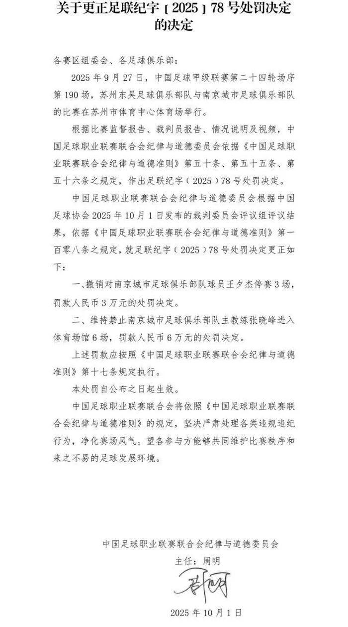 10 月 1 日,中足联在官网发布关于更正足联纪字 [ 2025 ] 78 号处罚决定的决定,其中决定撤销对南京城市足球俱乐部队球员王夕杰停赛 3 场,罚款人民币 3 万元的处罚决定。 ( 中足联、现代快报 )