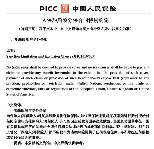 而包括中国在内的绝大多数非西方国家保险公司,事实上也都遵守了欧美的制裁规定,比如下面来自中国人保的 " 制裁限制与除外条款 " 中就明确写着: