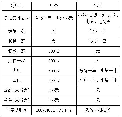 表 2 吴姨女儿出嫁随礼单